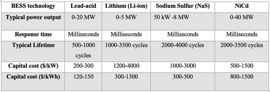 Table 3 - Comparison of various battery energy storage technologies for grid frequency support [34]