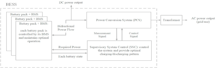 In few milliseconds all the battery pack in the BESS can charge/discharge the stored power to provide grid frequency support. The scheme of BESS is displayed in Figure.9, which includes the battery device, battery management system (BMS), supervisory system control (SSC) and power conversion system (PCS) [24-27]. Every battery pack equipped with a BMS for monitoring and maintaining the optimum process, and the full BESS is monitored by single system supervisory control (SSC). BMS and SSC control the current and ambient temperature, and therefore help the BESS: (1) lessen the probability of battery degradation (2) provide optimum charging/discharging cycle [24-29]. Power conversion system (power electronics) helps to achieve the bidirectional power flow and converts DC power from batteries to AC power to be utilized in the grid.