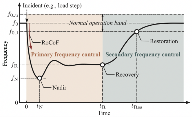 Three main factors for primary frequency control: inertia, RoCoF and nadir. In Figure 4, it is shown the role of these concepts.