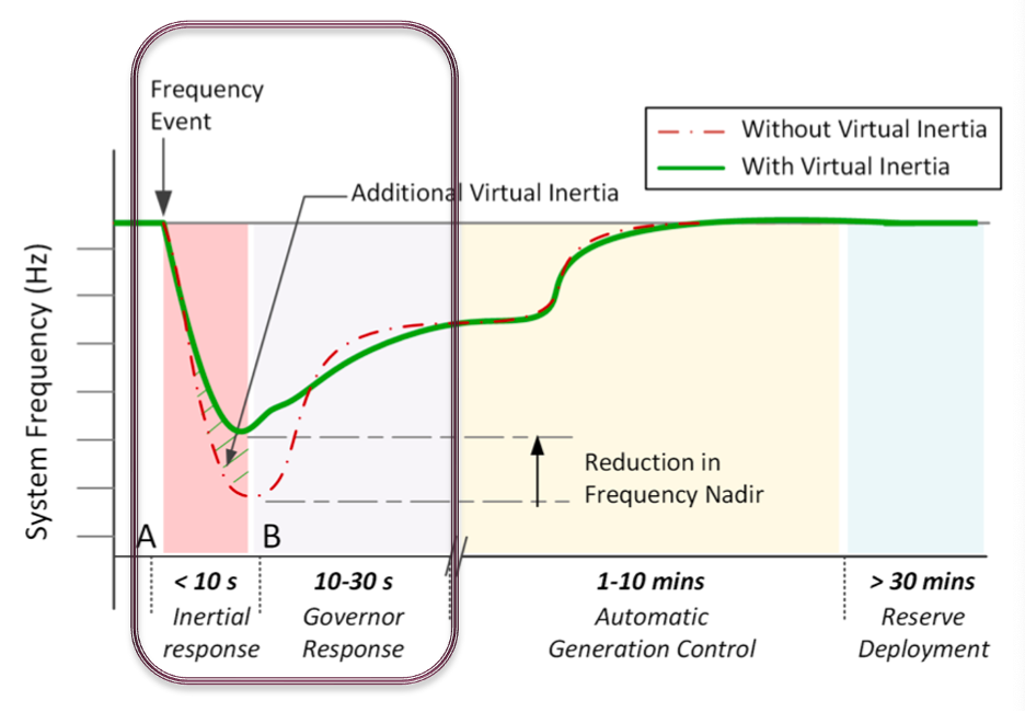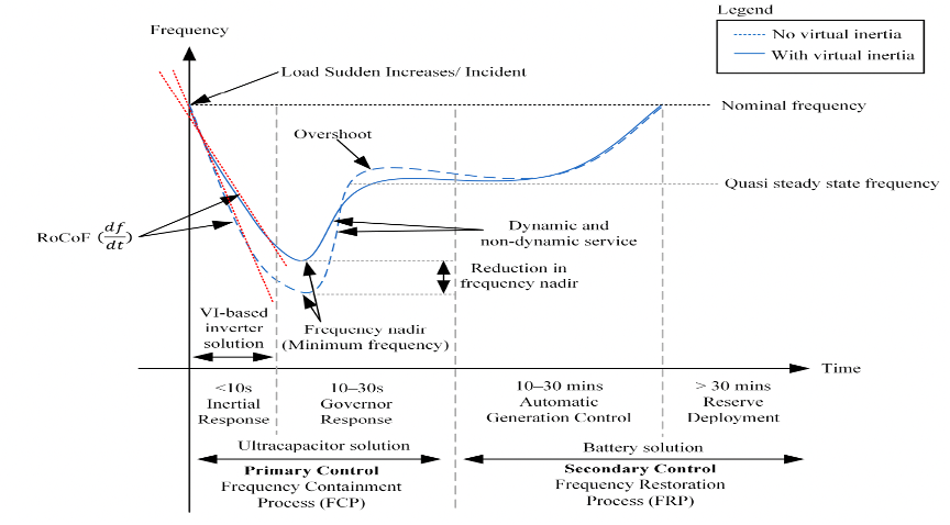 Recent developments in the generation mix have no inherent inertia [16]. This creates a reliability concern that may require the addition of new ancillary services, such as frequency responsive reserve and inertial response as it has been researched. The rapid developments in these technologies made it possible for some responsive load and storage to provide a frequency-responsive reserve along with generation. These changes in both the power system requirements for frequency responsive reserves, and the increased number of variable generations. In response to these new challenges, new control strategies have been introduced by researchers for converter-based generation, such as renewable generating technologies (RGTs), battery energy storage systems (BESSs), and virtual inertia synthesis and control, to deliver the so-called fast frequency response (FFR) [16]. The primary frequency control stage is where BESSs and Renewable Energy Source with virtual inertia fast-frequency response capabilities can participate to respond very quickly, and accordingly, they are suitable to participate in reduce frequency disturbances in the grid.