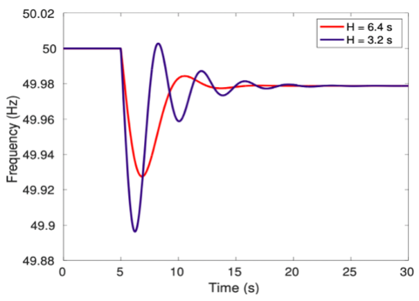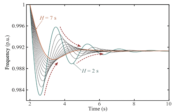 Figure 5 - Variation of frequency with various values of inertia constant [15]
