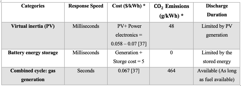 After identifying analyzing the three solutions for fast frequency control as ancillary services. Now, Table.4 will demonstrate the comparison as per the four proposed criteria.