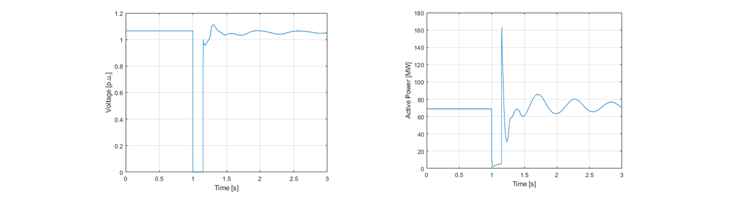 Figure 7 depicts the IBR response to a 3-phase fault. As it can be seen in the figures, the voltage cannot recover to its pre-fault value even though there is no topological change after clearing the fault. This leads to a reduced active power injection by the WFs connected to the POI. It is interesting to notice that after the fault clearing, some oscillations can be noticed in the active power trajectories. These oscillations are associated with the lack of numerical robustness of the REGC_A model. As presented in [10], for low values of SCR, the REGC_A has difficulties in maintaining numerical stability. This renders the REGC_A model not suitable for capturing the dynamic response of the IBR in low short circuit environments.