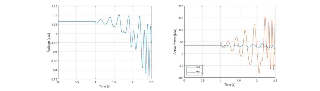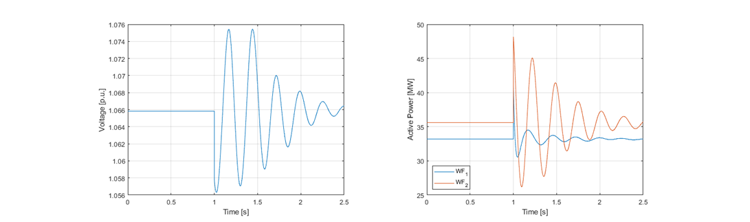 Left figure: Voltage at the POI. Right figure: Total active power output of WFs connected to the POI