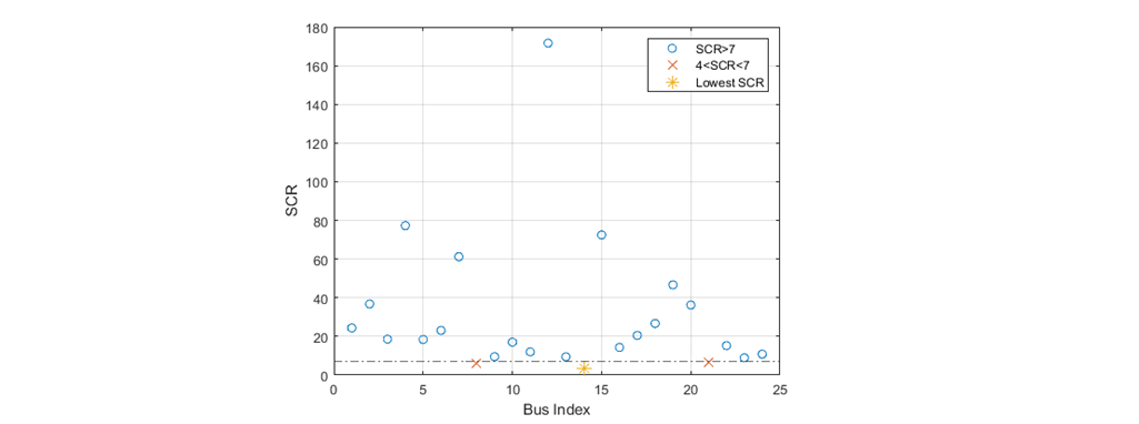- [1] Here, SCR is evaluated for each bus as ratio between the short circuit capacity and the MVA rating of the IBR at that bus. In this evaluation, the impact of nearby IBRs have not been considered, although this capability is there in GSAT