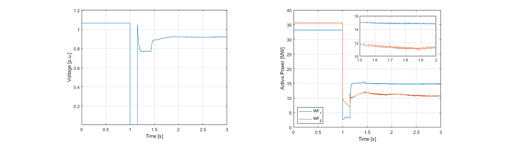 Left figure: Voltage at the POI. Right figure: Active power output of WFs connected to the POI