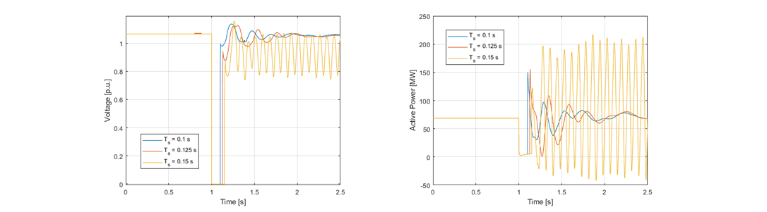 Figure 13 shows the IBR response to the same line outage but with different parameterization of the inner current controller. The left figure shows the voltage at the POI of the IBR plant and the right figure the active power output of the WFs connected to the POI. The REGC_C model is parameterized with current controller gains of 2.0 and 30.0, while the PLL gains were set to 20.0 and 700.0, respectively for the PI parameters. The figure shows that the responses of the WFs are stable even though the PLL gains are the same as in the unstable case. This indicates that increase of the inner current controller’s proportional gain improves the damping of the oscillatory mode and so the small-signal stability margins of the IBR.