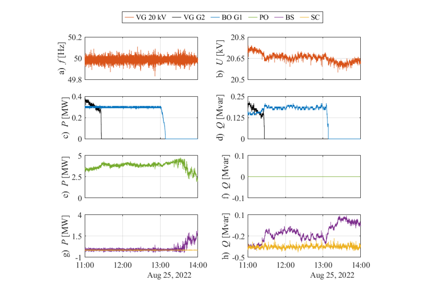 Figure 2 - Commissioning test on the 25th of August 2022. First time running with 100% inverter-based generation. a) VG 20 kV busbar frequency, b) VG 20 kV busbar voltage, c) VG G2 and BO G1 active power, d) VG G2 and BO G1 reactive power, e) PO active power, f) PO reactive power, g) SC and BS active power and h) SC and BS reactive power