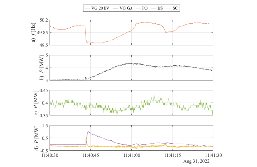 During the period of commissioning and testing, an unexpected outage of one of the hydro turbines occurred, and the responses from the other units online are seen on Figure 3. The generation from the hydro turbines are not included in the plot, due to a communication error and thus lack of available fast sampled measurements of BO G1 and BO G2. However, BO G1 was producing 0.4 MW and BO G2 was producing 1.1 MW, but due to some error, an outage occurred on BO G2. This outage corresponds to around 20% of the total production, which is also clear in the significant frequency drop. The PV panels were producing around 140 kW.