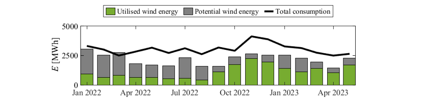 The utilisation of the potential WP production has increased significantly since the SC and BS were commissioned, which allowed for 100% wind and PV power production from September 2022, see Figure 6. The figure shows that between January 2022 and August 2022, the utilisation of the potential wind energy was between 20% and 40%, while it from September 2022 to May 2023 was between 70% and 90%, with the exception of January 2023 and February 2023. The reason for this is that the BS was out of service for some weeks for control updates. The present curtailment is due to the mismatch between the wind and the demand.