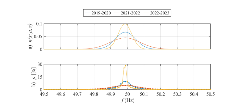 Plot b) on Figure 7 shows the probability of the occurrences of the measurements with a resolution of 10 mHz. The improvement is even more visible in this plot, and it is quite clear that the BS regulates within a deadband, which the majority of the measurements are in.