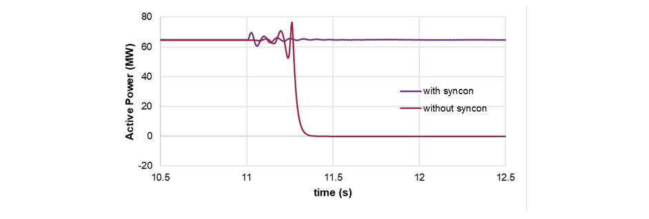 A number of scenarios were tested for a GW-scale power system using detailed EMT models of the IBR in a large-scale power system simulation to test the notion of synchronous condensers’ ability to sustain a synchronous grid reference, and to keep the grid-following IBR (including battery energy storage system (BESS)) latched-on and the power system stable following a disturbance.