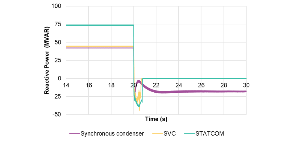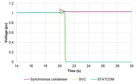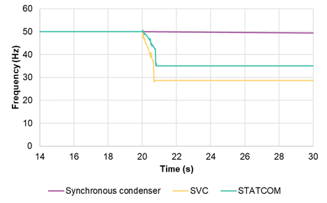 Additional sensitivity was studied by replacing the synchronous condenser in Figure 8 of the conceptual 2-bus test system with a grid-following SVC and STATCOM, respectively. The breaker connecting the ideal voltage source in Figure 8 was disconnected at t = 20 s. As seen from Figure 11, the network voltages and frequency collapse with the use of grid-following SVC and STATCOM instead of a synchronous condenser, as they cannot sustain a rotating grid reference. The reactive power contribution of each of these devices is shown in Figure 12. As can be observed, the grid-following SVC and STATCOM provide a response within tens of milliseconds, but the response cannot be sustained as the lack of grid reference forces their output to zero, upon the disconnection of the ideal voltage source in Figure 8.