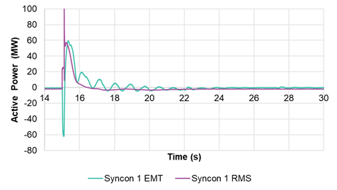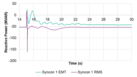 Figure 14 - Synchronous condenser active and reactive power responses – comparison between EMT and RMS tools