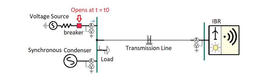 Figure 8 - Conceptual 2-bus test system – IBR serving load with synchronous condenser