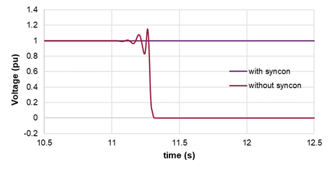 To further investigate the notion of grid reference provided by a synchronous condenser, a conceptual 2-bus test system shown in Figure 8 was simulated.
