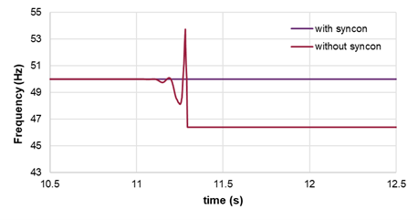 figure 6 - Synchronous condenser rotor speed and network frequency – trip of 200 MW generation within island