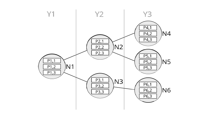 System operation is modelled through a set of representative days, weeks, or months, which are assumed to be independent. For instance, in Figure 1 the operation of each node is represented through three typical periods, which are labelled PX,Y, where X is the node number and Y is the period number. To clarify this even further, this means that the operation in node 1 will be represented by three typical weeks (could be days or months) of operation with hourly resolution. These three weeks are selected (for instance, through a bespoke clustering methodology) from the 52 weeks in the year under analysis for that node and could for example correspond to one week with the highest demand, one week with the lowest demand, and the one with average conditions. Each of the representative periods can have a different weight throughout the year. Investment decisions for new assets are made at each node of the tree.