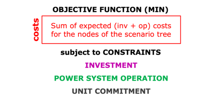 - Power system constraints: these correspond to all the constraints associated with power system operation, including energy balances, reserves, power flow, transmission limits, etc.