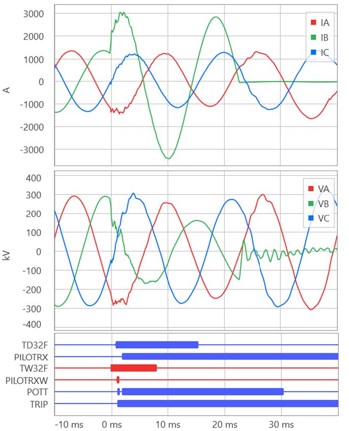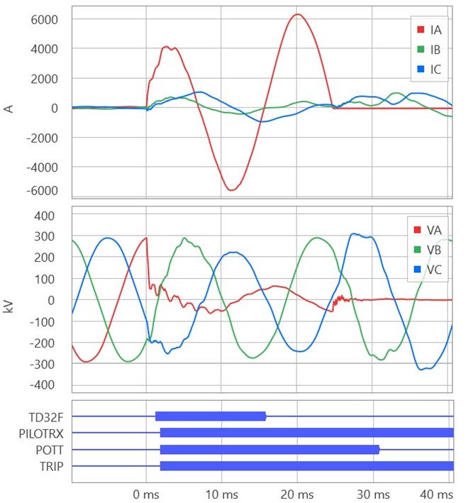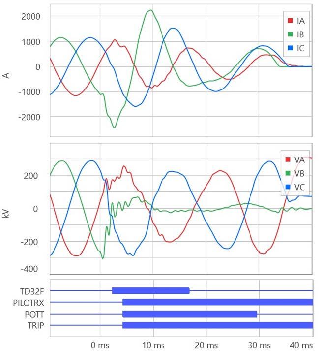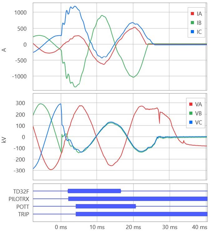 Fig. 1 shows the currents and voltages recorded at the terminals of a 40 mi 345 kV 60 Hz transmission line for an internal C-phase-to-ground fault. Transient-based line relays [3] asserted their trip commands in 0.8 ms and the two-cycle SF6 circuit breakers interrupted the fault in about 23 ms for a total fault clearing time of 24 ms (1.5 cycles). The traveling-wave differential scheme (TW87) operated first (0.8 ms). The permissive overreaching transfer trip (POTT) scheme operated second at about 2 ms into the fault. The POTT scheme works with the traveling-wave (TW32) and incremental-quantity (TD32) directional elements, which asserted in 0.1 ms and 1.5 ms, respectively. This installation uses a direct (point-to-point) fiber protection channel with an end-to-end latency of 0.35 ms.
