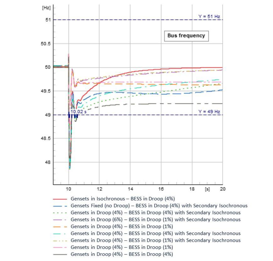 The studies were completed to test the stability and performance of a range of load scenarios, contingencies, operating mode combinations and primary droop % settings. The following figure shows the result of a trip of the solar farm and one battery energy storage system (connected via the same circuit breaker) for a range of droop % settings.