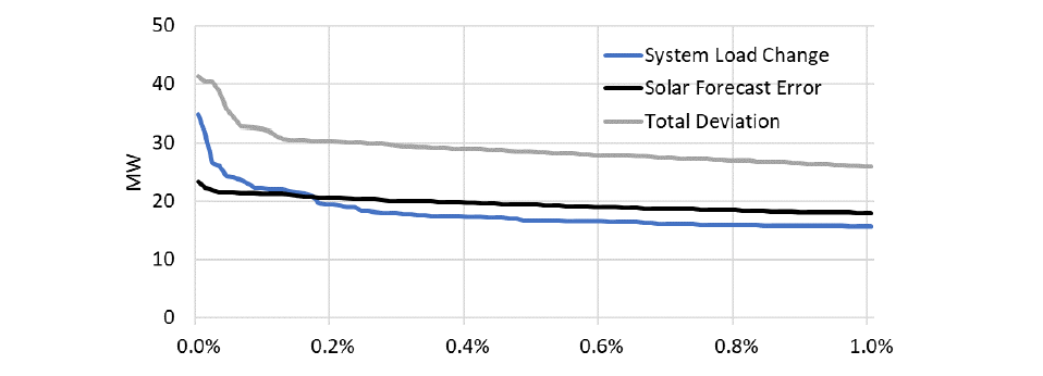 In contrast, over the highest 1%, the system load changes are typically slightly smaller than the solar farm forecast errors, but the largest system load changes exceed the largest solar forecast errors. The largest change over 30-minutes is approximately 35 MW, but a single 5-minute change of approximately 40 MW was observed in the dataset. Note also that the figure also shows only the system load changes in the upwards direction (i.e., increasing underlying demand or decreasing BTM solar output). The largest system load changes in the downwards direction are comparable to those in the upwards direction.