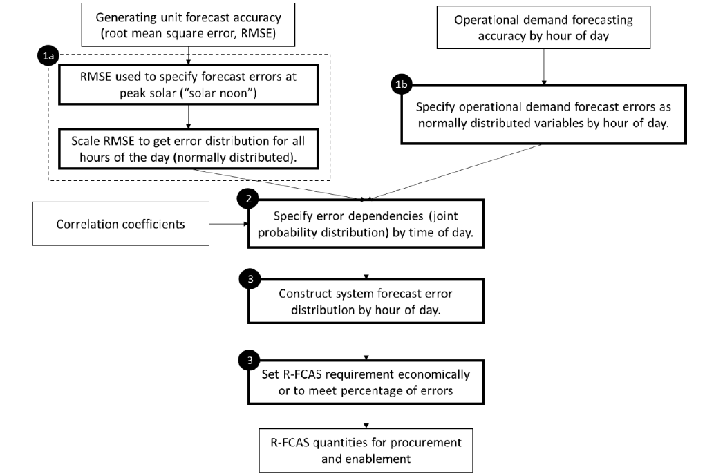 A probabilistic approach is proposed to determine the quantum of required R-FCAS to meet the firming and regulating requirements because of the uncertain nature of forecast errors. Under this approach, participants that cannot meet the codified forecasting standard would nominate the accuracy to which they are able to forecast. The power system operator would then use participant’s nominated accuracy to determine the R-FCAS requirements, in the following process (see Figure 1):