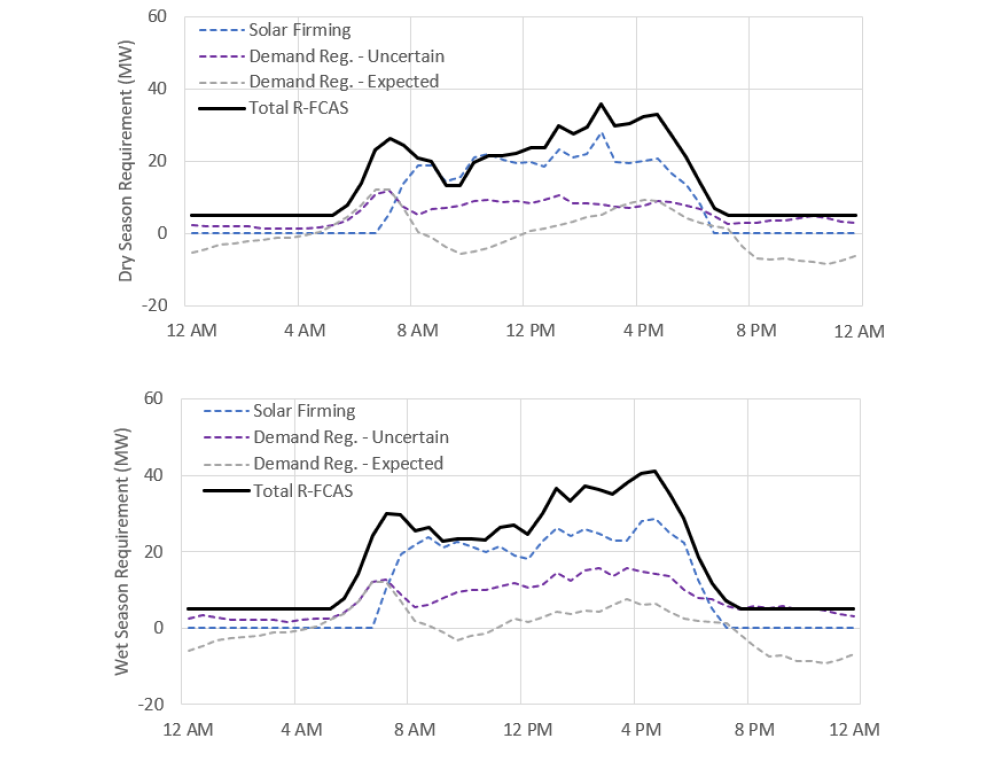 For 2021/22 with 55 MW utility-scale solar generation, the wet season, daytime R-FCAS requirements are found to be within the range of 40 – 45 MW, while slightly reduced requirements of 35 – 40 MW apply for the dry season. The greatest requirements apply from mid to late afternoon, when demand is ramping up, and there is substantial uncertainty in available solar generation.
