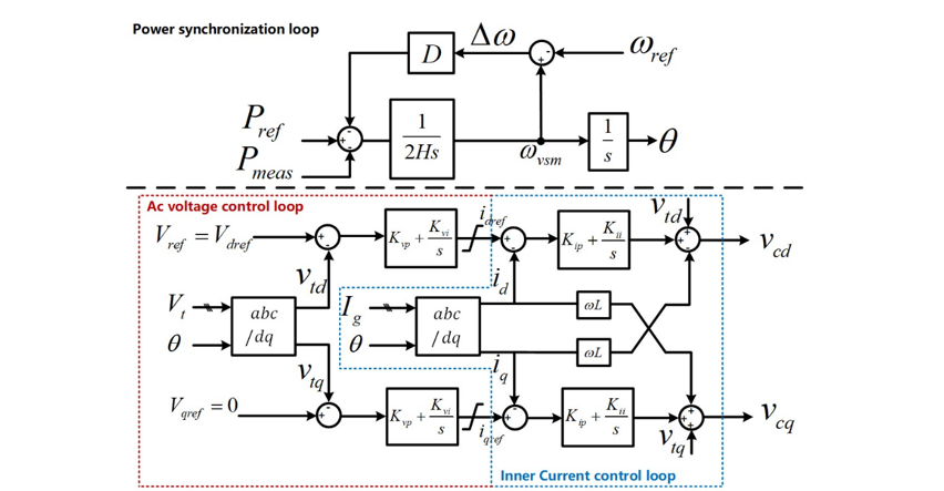 The control structure of a VSM is shown in Fig. 4. The power synchronization loop above the dotted line emulates the swing equation of a synchronous machine. H is the virtual inertia constant, and D is the damping coefficient. Like a synchronous machine, the power synchronization control of a VSM uses the swing equation to generate the ac voltage synchronization angle θ at the Point of Common Coupling (PCC).