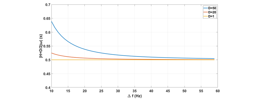 As the damping coefficient D for a VSM is significantly larger than that of a synchronous machine, the impact of D on the result should be considered for inertia estimation. Fig. 6 shows the theoretical calculation result of with nominal frequency f0, injection probing current frequency fh ranging from 1 Hz to 50 Hz, giving a value of