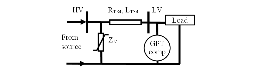 The risk of losing voltage stability arises from the current drawn through the delivery system during the period that a transformer’s instantaneous magnetising inductance ZM shown in Fig. 14 is low. The shunt inductance is non-linear, varies with time during a fundamental frequency wavelength, and can be modelled as a periodic signal with frequency components [51]. The physics-consistent GPT measurement accommodates the asymmetrical waveform distortion, frequency-dependent impedances, and unbalance caused. If compensation is applied as shown in Fig. 14, with the compensation currents defined by the GPT, the load will draw its power through the delivery system such as to minimise the losses, and voltages will improve, which reduces the risk of voltage instability.