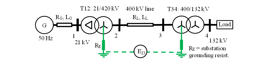 Figure 15 – 4-bus system exposed to E-field inducing GIC in ground circuit