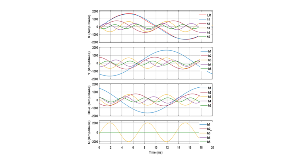Fig. 17 shows the whole current I_R in wire 1 at the PoC of the load just before compensation is implemented, and the current components h1 to h5 in all four wires resolved by Fourier decomposition. (THDi=5.5%; a gain of x12.5 is applied to the small harmonic waveforms h2 to h5.) The small difference between the fundamental frequency sinusoid in wire 1 and the actual distorted current is barely evident in the top panel. As expected, the equal triplen harmonic currents do not form a balanced 3-phase supply and, instead, sum in the neutral. The decomposition returns the angles of the components referenced to wire 1, as well as their magnitudes, but the CRMS angles will be referenced to the wire 1 voltage for the GPT input.