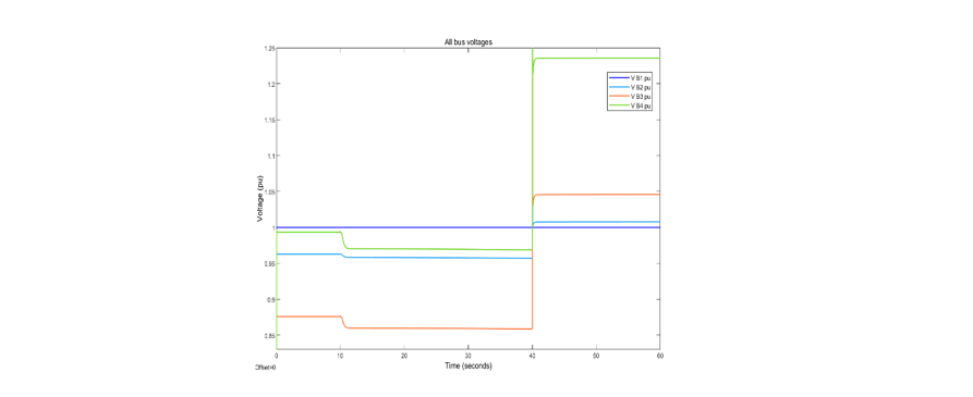 The GPT-based compensation introduced at 40 s increases the voltages at Buses 2, 3 and 4, and tapping transformer T34 would return the Bus 4 voltage to its set level. (The spike when compensation is implemented is an artifact of the simulation).
