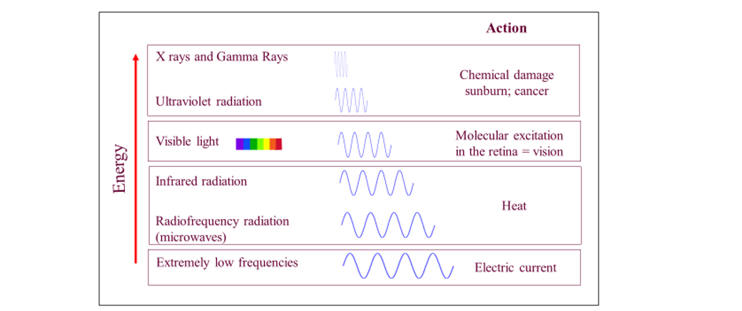 Figure 1 shows, in decreasing order of energy, the names commonly used to designate electromagnetic waves and their corresponding effect on the human body.