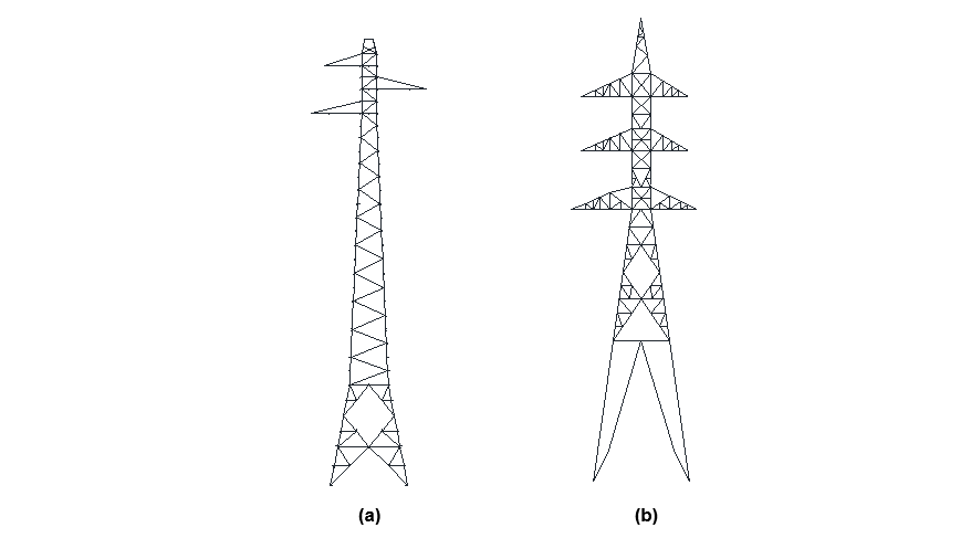 To conduct a practical and realistic study, two real full-scale types of lattice tower structures have been selected. The towers are widely used by the research group partners, Hydro-Québec of Canada and RTE of France. The H2 tower, as shown in figure 1-a, is a single circuit tower designed for 63/90 kV transmission lines built in France. The total height of the structure is 32 m with a square base of 3.4 m X 3.4 m. The tower has similar faces in each four planes with a staggered triangular bracing pattern.