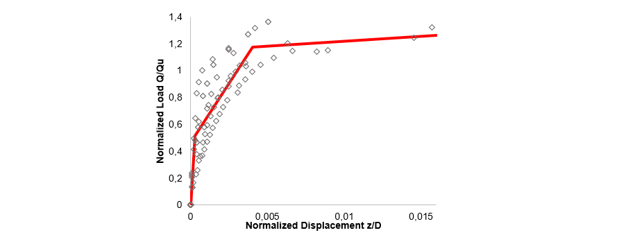 If force-displacement points from all available tests of the same soil type are plotted in one graph, a scattered cloud of points appears as illustrated in Figures 5 and 6 for sand and cohesive soil respectively.