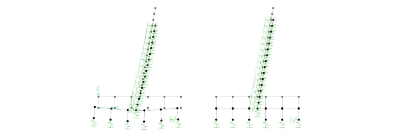 Similar to H2 tower, the designed compression and horizontal forces on the BSG tower’s foundation have been assigned to the developed stiffness matrices. The major component of applied force is in vertical compression in Z direction with a value of 1141 kN. Longitudinal and transversal force components are equal to 18 and 22 kN. Figure 20 presents the resulting vertical displacement of the soil-foundation system for both rigid and flexible foundations of grillage and concrete types. The left bars show flexible and rigid grillage foundations, while the right bars show flexible and rigid concrete foundations. Results demonstrate that the displacement difference between flexible and rigid concrete foundation is not so significant, comparing to that of rigid and flexible grillage foundations.