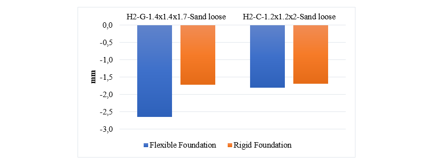 Figure 18 shows vertical displacement, due to the applied translational designed force, of grillage foundation (flexible and rigid) in different soil types for H2 tower. The applied forces include a major vertical compression force equal to 220 kN along with longitudinal and transversal forces of 7.2 and 7.0 kN. In the following figure H2-G means H2 tower with grillage foundation; the numbers after it represent length, width and depth of the foundation.