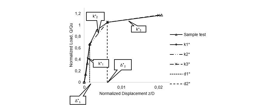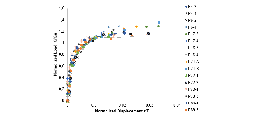 To regroup all available test data, and also consider soil properties and foundation geometry, a normalization, in accordance with the one presented in [31], has been performed for both the displacement and the force axes of the curve. That is, the displacement is normalized by the depth of the foundation (z/D), where z is the vertical displacement from experiment and D is the depth of embedment of the foundation. Similarly, the force is normalized by the measured rupture resistance (Q/Qm), where Q is the vertical force applied in experiment and Qm or Qu or is the measured rupture resistance. The results of normalization for the two soil types are presented in Figures 7 and 8. It could be observed that the normalized data points are now regrouped and share similar pattern. The normalized force-displacement curves could then be used to replace the axial stiffnesses in the case of foundation uplift. It should be noted that, unlike the equations of Gazetas, the flexibility of the foundation is integrated in this evaluation of the stiffness. Besides, a nonlinear behaviour of the soil-foundation system under uplift force is observed, which could be subsequently considered in advanced numerical modeling of the towers and foundations. However, to do so, a nonlinear curve should be fitted through the graphs of figures 7 and 8. This is done in the next subsection.