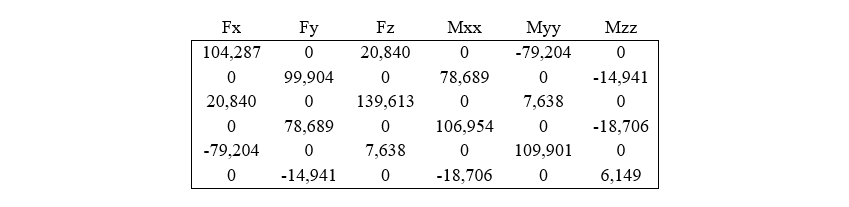 Finally, the suggested method resulted in a complete six by six symmetrical stiffness matrix, for which the coupled terms have also been calculated in addition to diagonal terms. As the foundation’s column is inclined, additional coupled terms are generated in the stiffness matrix.