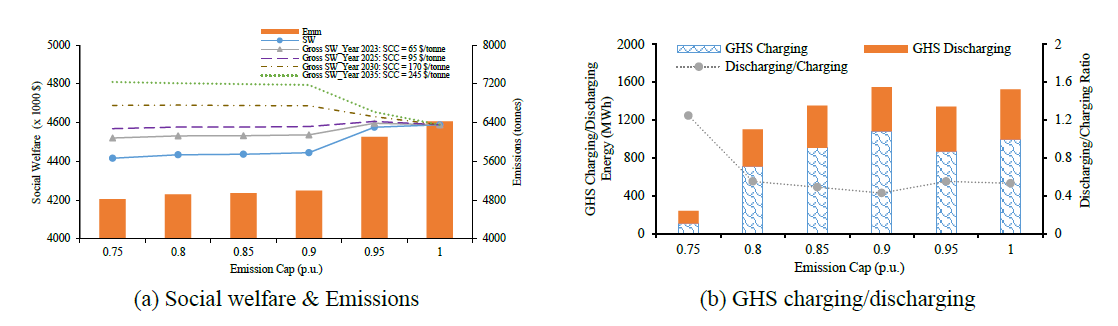 It was observed from the studies presented that emission cap was more effective strategy when the impact on social welfare and reduction in system emissions are considered to be determining factors; on the other hand, carbon pricing was the preferred approach if the impact on MCP is the determining attribute, in both Alberta and Ontario systems. From the MCS studies considering RES (wind and solar) uncertainties, it was noted that both systems in each scenario converged to their expected values. From the sensitivity analyses, it was seen that as the emission cap was relaxed (0.6 to 1 p.u for Alberta and 0.75 to 1 p.u. for Ontario) the social welfare increased while the GHS discharging to charging ratio decreased. When the SCC was increased in increments of 15 $/tonnes from year 2023 to 2035, the system emissions decreased while the gross social welfare increased, with more significant effect observed in Alberta as compared to Ontario. It was observed that when the carbon price was considered and varied from 55 $/tonnes to 80 $/tonnes in steps of 5 $/tonnes, the social welfare and system emissions both decreased, with more noticeable impact seen in Alberta as compared to Ontario. It was noted that when the initial condition of GHSs’ storage tanks was varied (20% to 80% of its maximum capacity), then for Alberta with higher initial pressure, the social welfare and total emissions increased while they decreased for Ontario. It is anticipated that with reduction in GHS cost metrics and technology development, their penetration in electricity markets will increase, resulting in lowering of emissions and MCPs. GHS possesses generation, storage and consumption components which can assist the system operators to meet the complex needs of the power grid and help in achieving a net-zero GHG emissions grid.