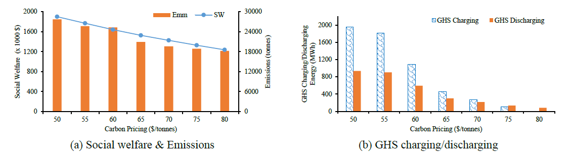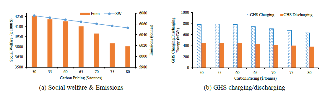 A study was performed to examine the impact of carbon pricing on system attributes by varying the price from 55 $/tonnes to 80 $/tonnes in steps of 5 $/tonnes. From Figure 11(a) and Figure 12(a), it can be observed that with increase in carbon pricing, the social welfare and system emissions reduced in both Alberta and Ontario. The reduction in case of Alberta was more significant (in the range of 50%) while in Ontario the reduction was lower, in the range of 5%. This is because the share of low/zero emission resources in the energy mix of Ontario is 72%, as compared to 19% in Alberta. With increase in carbon price, the GHS charging/discharging operations were reduced, more noticeably in Alberta (Figure 11(b)) as compared to Ontario (Figure 12(b)).