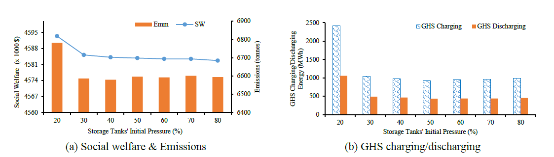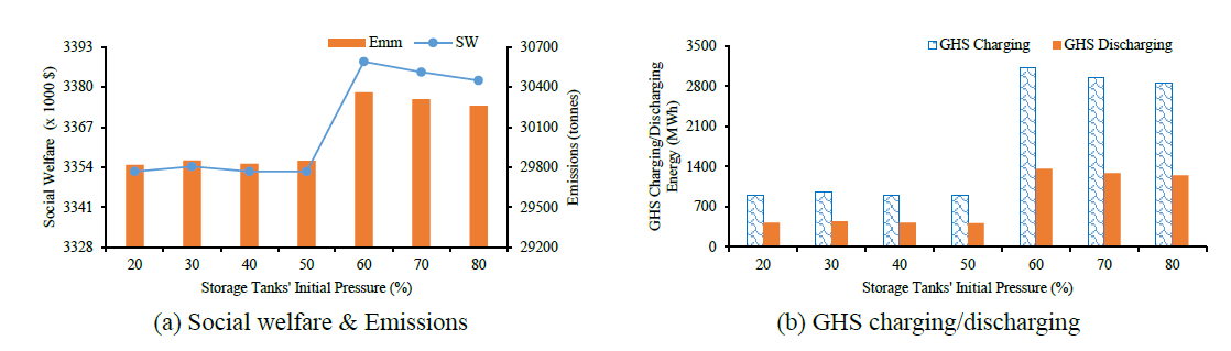 From Figure 13(a), it can be noted that for Alberta, with the increase in initial moles content (pressure) of GHS storage tanks, the social welfare and system emissions remained at a fairly uniform level up to 50% and increased significantly at 60%. This is because with higher initial moles content, the total generation cleared from gencos are higher as compared to that with lower inital moles content, which leads to higher charging of GHSs and hence increased social welfare but at the price of higher system emissions. Alternatively, when the same sensitivity analysis is carried out by imposing emission constraint in the model where emissions are restricted to that obtained in case of 20% then, with increase in the initial pressure of GHS storage tanks the social welfare reduced; for instance the social welfare obtained are $3,352,625 and $3,312,832 at 20% and 60% inital pressure of tanks, respectively. In Ontario, the social welfare and system emissions decreased with the increase in initial moles content of GHS tanks (Figure 14(a)). Similar effect is observed on charging/discharging operations of the GHS units for both systems, Alberta and Ontario, as presented in Figure 13(b) amd Figure 14(b), respectively.