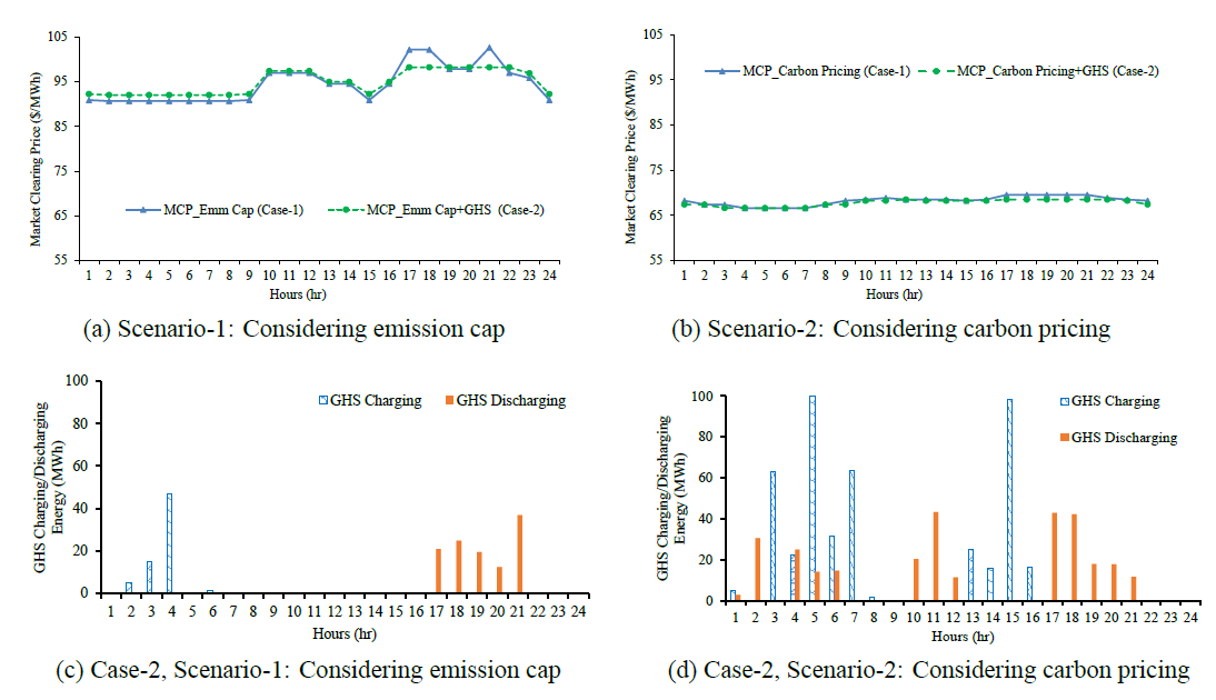 With the goal to achieve a net-zero CO2 emissions grid, two potential emission control strategies are proposed herein, considering their ease of implementation and being realistic, namely, emission cap and carbon pricing. The emission cap is included as a constraint in the market settlement mathematical model while the carbon pricing strategy is included by modifying the model objective function. Figure 3(a) shows the MCP profiles over 24-hr horizon obtained for Alberta when an additional constraint to cap the emissions (Scenario-1) to 60% of the existing emissions (base case) is considered. The two curves corresponds to cases without (Case-1) and with (Case-2) GHSs participation, respectively. The MCPs increased when an emission cap was included in both cases as compared to the base case, however, the spikes in energy prices during peak hours (17,18 & 21) were flattened in the latter case when GHSs participated (Case-2). This is due to the fact that GHSs discharge during these hours (as shown in Figure 3(c)) to limit the price rise, as they are cheaper resources and do not contribute to emissions, being net-zero CO2 emissions resources. While, Figure 3(b) presents the Scenario-2 MCP plots when carbon pricing is included in the objective function considering the emission factors from each resource, in the market optimization model. It can be noted that consideration of carbon pricing increased the MCPs in comparison to base case, however the increase in Case-2 was flattened during peak hours as compared to Case-1 due to discharging operation of GHSs at those hours (Figure 3(d)).