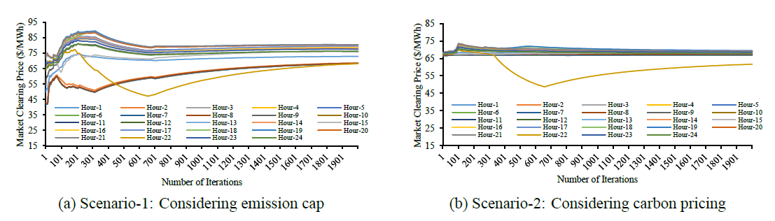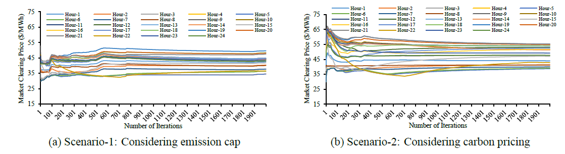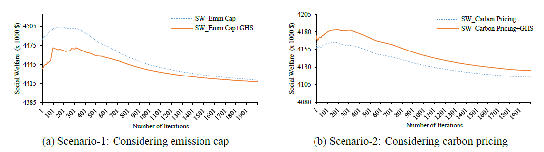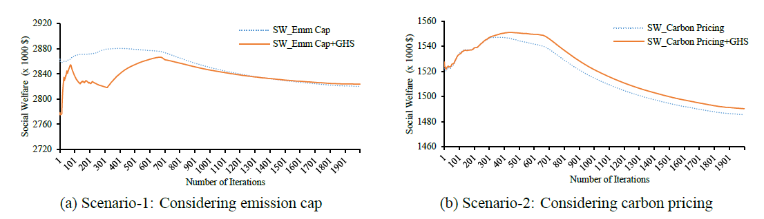 To evaluate the model performance and effectiveness, Monte Carlo Simulation (MCS) is carried out over 2,000 samples by varying the RES generation (wind and solar) in DAM settlements, for each system, Ontario and Alberta. For the Alberta system, Figure 5(a) presents the expected social welfare without and with GHS for Scenario-1 (considering emission cap) and Figure 5(b) shows the social welfare for without/with GHS for Scenario-2 (considering carbon pricing), demonstrating their convergence. Figure 6 presents the convergence of hourly MCPs without and with GHS in each of the scenarios, for Alberta.