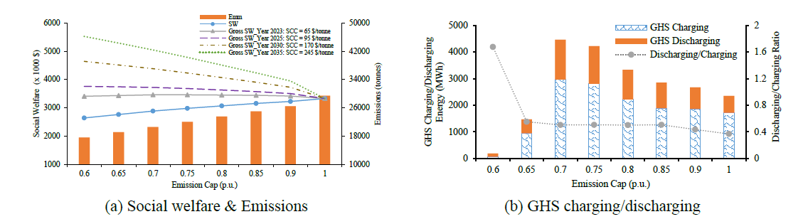 For Alberta, the emission cap is varied over a range from 0.6 to 1 per unit (p.u.), i.e. emissions are varied in range of 60% to 100% of BAU emissions, and its effect on the social welfare and GHS charging & discharging operations are examined. It is noted from Figure 9 that as the emission cap is tightened, the social welfare decreases while the GHS discharging to charging ratio gradually increases, up to the cap value of 0.7 p.u., and beyond that, charging/discharging operations are significantly reduced. In the case of Ontario, the emission cap was varied from 0.75 to 1 p.u. and the results show that the social welfare decreased as the emission cap was tightened (Figure 10(a)) and the GHS discharging/charging ratio increased (Figure 10(b)).
