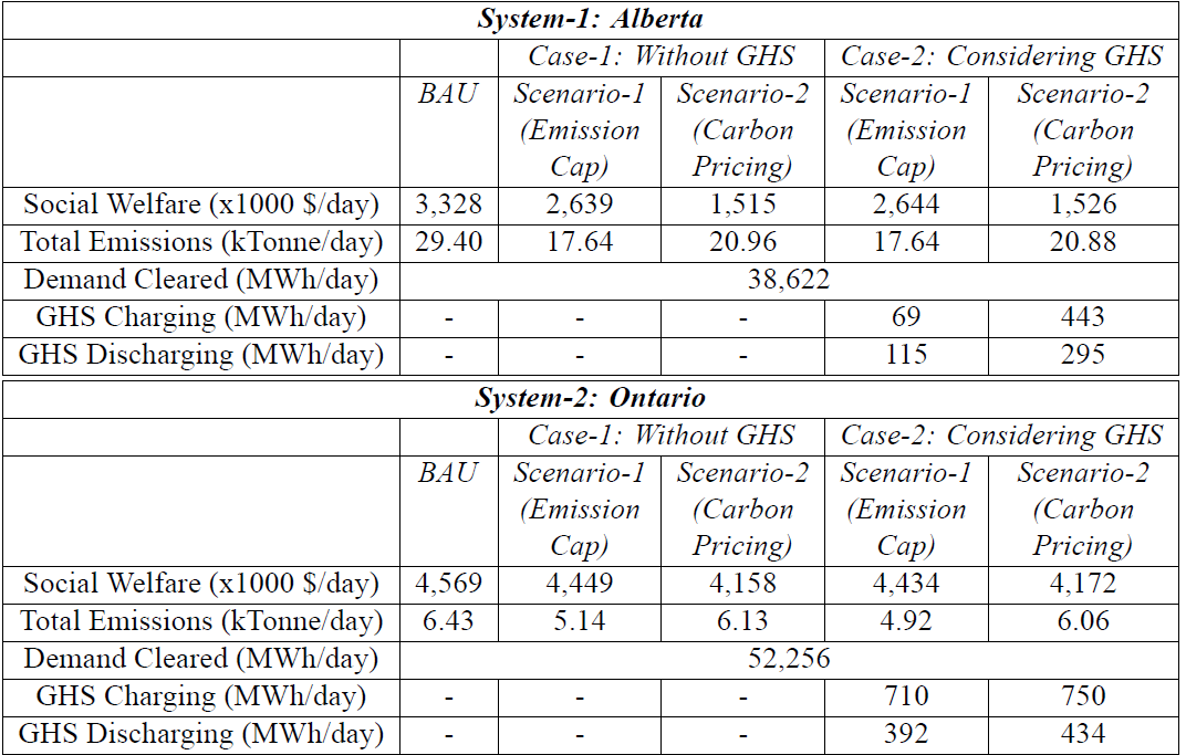 Table 2 presents a summary of some market clearing results of the UMP-based DAM for both the systems under study. For Alberta, it can be noted that the social welfare increased in both scenarios in Case-2 as compared to Case-1; thus GHSs participation yielded higher social welfare. The consideration of emission cap (Scenario-1) restricted the total emissions to 60% (17.64 kTonne) of the base case emissions (29.4 kTonne). It can be seen that GHSs participated in the market more through discharging operation than charging, in Scenario-1 to satisfy the emissions cap. The social welfare decreased in Scenario-2 for each case in comparison to Scenario-1 due to the consideration of carbon pricing. The inclusion of carbon pricing in the market model resulted in reduction of emissions (20.9 kTonne) as compared to base case emissions (29.4 kTonne). The GHSs participation in Scenario-2 was considerably higher than Scenario-1 because their bids/offers were in the range of carbon price and MCPs which resulted in their increased participation while, in Scenario-1 more gas-fired generators had to be dispatched to satisfy the emission cap and other UC constraints, hence limiting the GHSs participation.