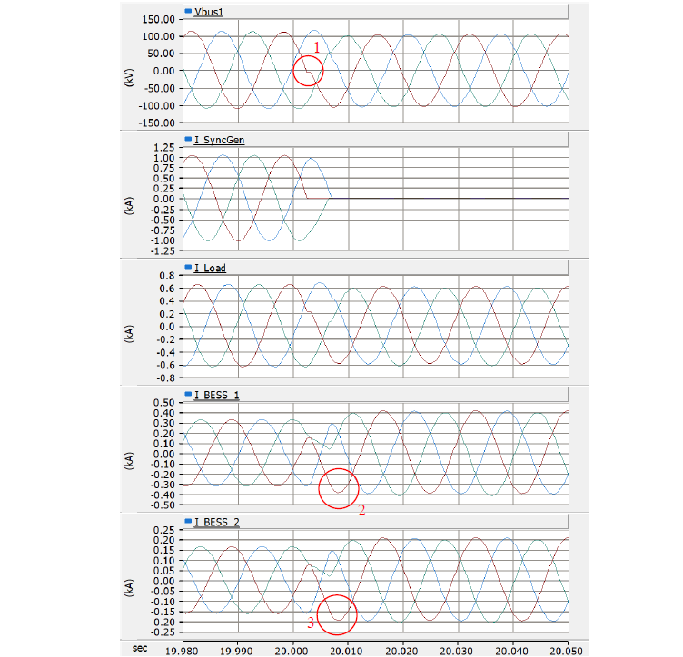 The following observations can be made from Figure 3 which shows the instantaneous quantities of the Test 2 simulation results, including bus voltage (Vbus1), synchronous generator current (I_SyncGen), load current (I_Load), BESS 1 current (I_BESS_1) and BESS 2 current (I_BESS_2).