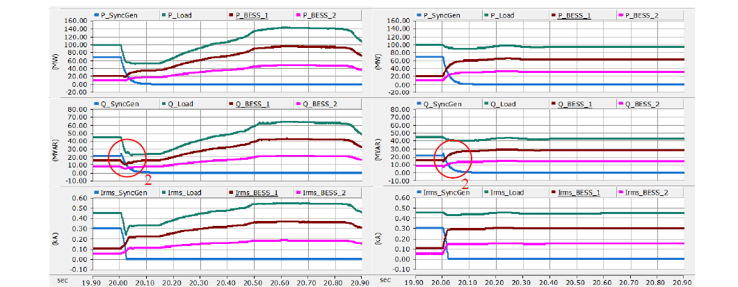 The test system is initialized as described in Table 1. Figure 2 [10] shows the RMS quantities of the Test 2 simulation results including bus voltage (Vbus1_rms), frequency, synchronous generator active power (P_SyncGen), load active power (P_Load), project BESS (BESS 1) active power (P_BESS_1) and duplicate BESS (BESS 2) active power (P_BESS_2), reactive power, and current. The following observations are made: